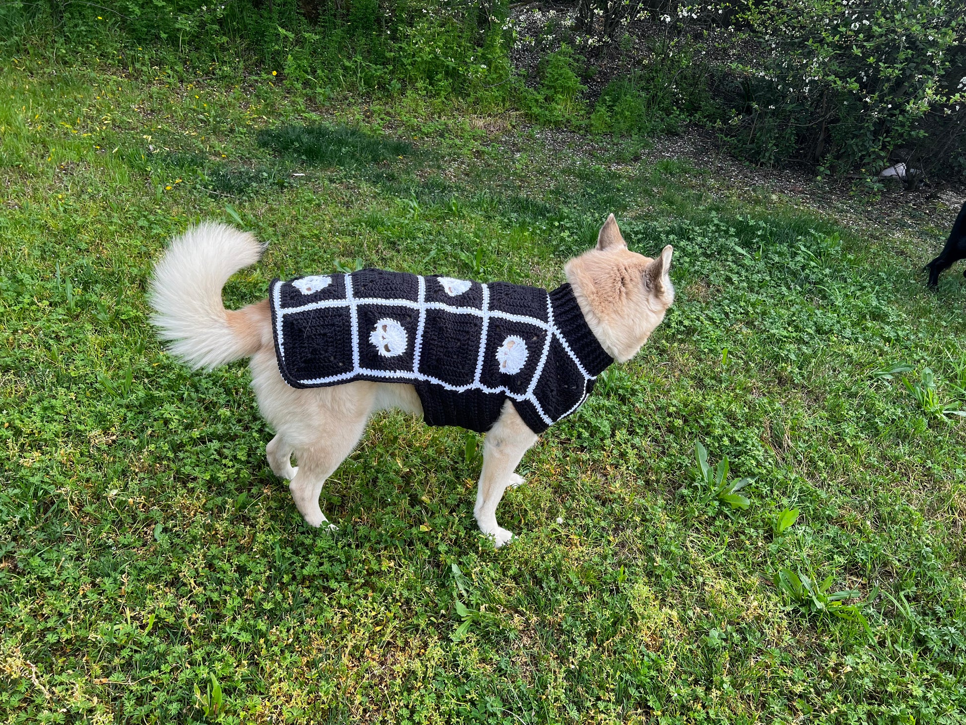Introducing our awesome Skull Dog Sweater, a cozy and stylish accessory to keep your furry friend warm in colder weather. Handcrafted with love, the sweater features a skull and solid granny square pattern, adding an alternative touch to your pet's wardrobe. Made from high-quality, soft yarn, this sweater ensures comfort and warmth, making it perfect for walks or lazy days at home. Treat your loyal companion to both comfort and fashion with this delightful canine accessory.